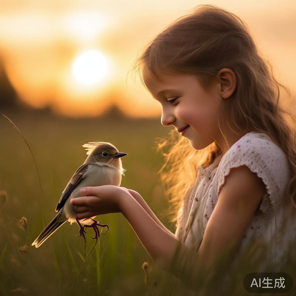 当小女孩轻轻握住那只小鸟时,仿佛她的手掌中蕴藏着拯救生命的力量。那么,在每一次触碰之中,是不是都隐含着一种无形的约定:要给予这一切生命以希望?又或者,当看到小鸟再度展翅高飞的瞬间,那种欢愉是否让她想起了自己所有的期待与梦想?